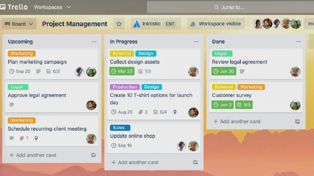 Below, you can see the example of a Trello board. Here, each card represents a certain task. Users can drag and drop cards between columns to indicate progress, assign tasks to team members, add due dates, attach files, and leave comments.